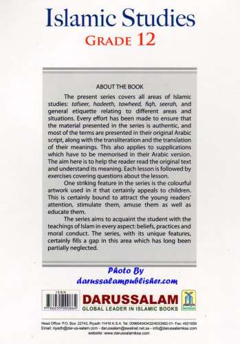 This Grade 12 textbook (for the twelfth grade level) is part of the Islamic Education series which covers all areas of Islamic studies: tafseer, hadeeth, tawheed, fiqh, seerah, and general etiquette relating to different areas and situations. Every effort has been made to ensure that the material presented in the series is authentic, and most of the terms are presented in their original Arabic script, along with the transliteration and the translation of their meanings. This also applies to supplications which have to be memorized in their Arabic version. The aim here is to help the reader read the original text and understand its meaning. Each lesson is followed by exercises covering questions about the lesson.